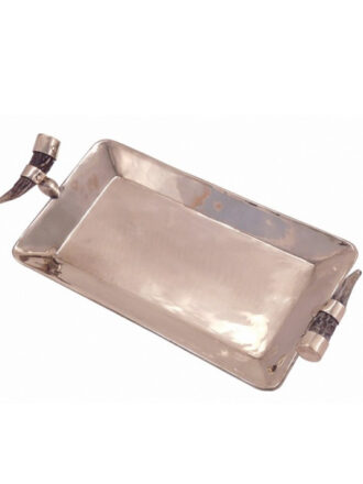 For HomeFinely elaborated handworked tray, made of metal and polished or unrefined goat horn. Heigth:5 cm – Lenght: 47 cm – Width: 36 cm